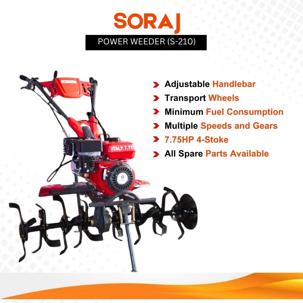 The Power Weeder with SORAJ Engine (7.75 HP) is a high-performance agricultural power weeder machine designed for efficient weed removal, soil cultivation, and inter-row farming. Built with a powerful 248 CC petrol engine, this machine delivers reliable performance for small to medium farms.