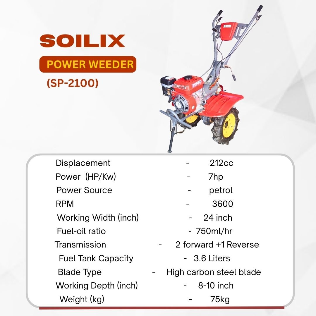 The Power Weeder with SOILIX Engine (7.5 HP) is a high-performance agricultural power weeder machine designed for efficient weed removal, soil cultivation, and inter-row farming. Built with a powerful 212 CC petrol engine, this machine delivers reliable performance for small to medium farms.