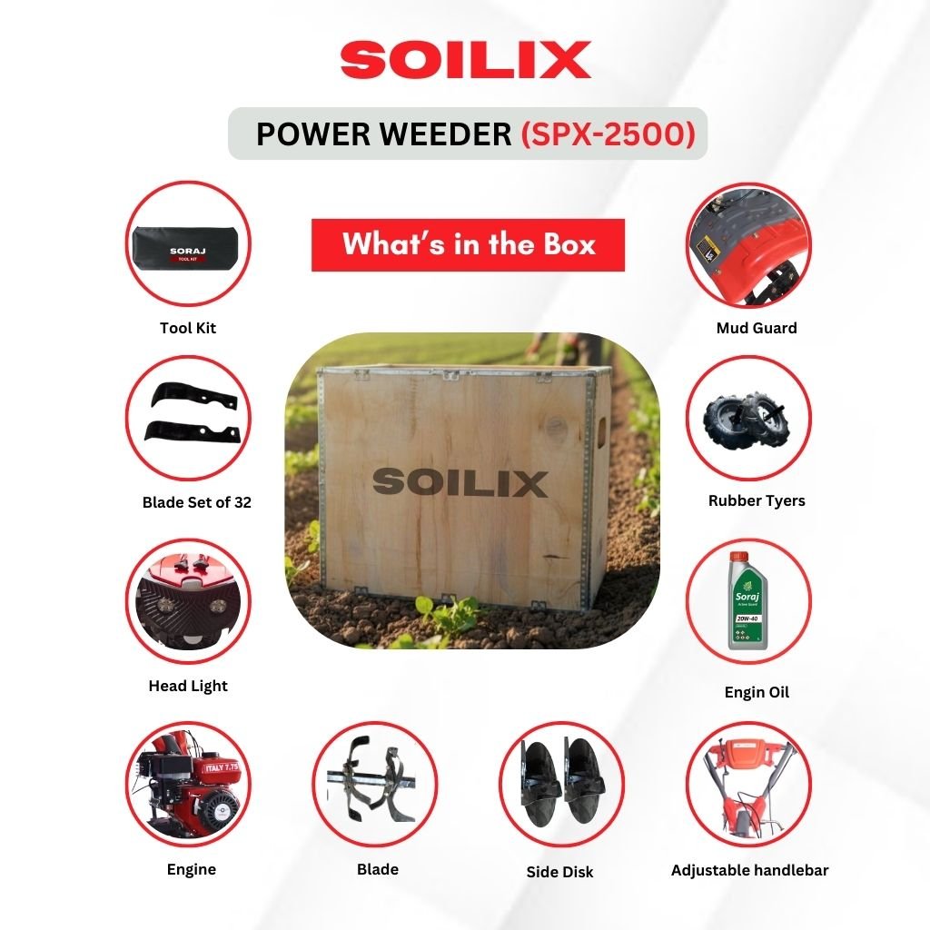 The SOILIX SPX-2500 petrol power weeder reduces manual labor, saves time, and increases farm productivity. Its powerful engine, wide blade coverage, and durable build make it an ideal choice for farmers seeking a reliable and efficient power weeder machine.