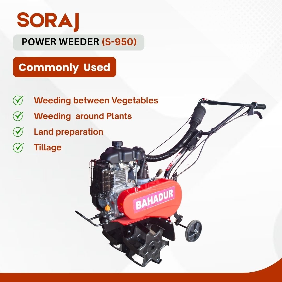 The Soraj Brand Power Weeder is a strong and reliable agricultural machine specially designed for vegetable farming and row crops. It is powered by a 5.5 HP engine and is suitable for different field conditions.