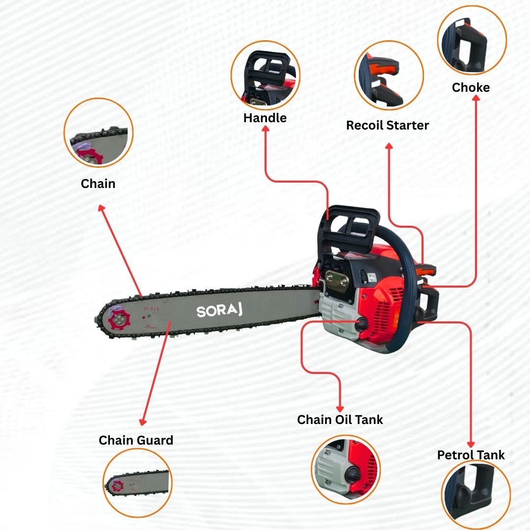 The SORAJ CHAINSAW CH-30 is a powerful and durable cutting machine designed for efficient and reliable performance. Powered by a 56cc 2-stroke air-cooled engine, this chainsaw offers smooth operation with balanced power output, making it suitable for heavy-duty cutting tasks.