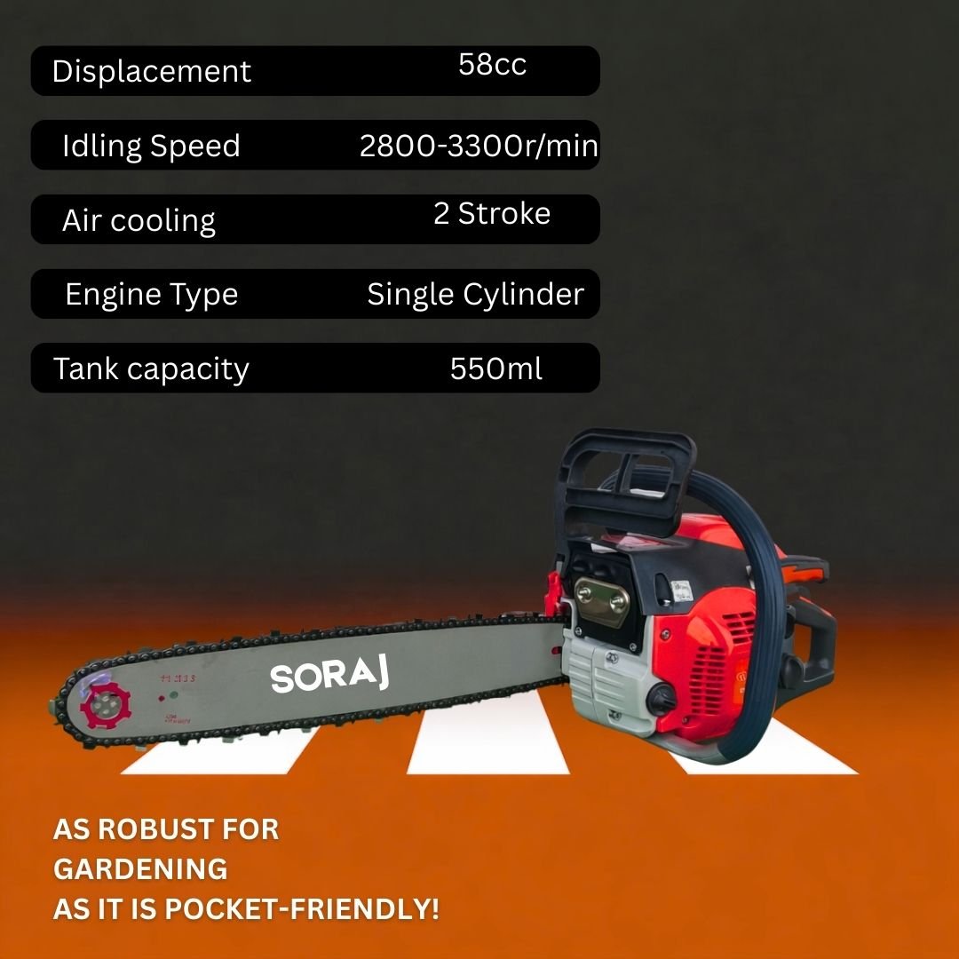 The CHAINSAW CH-20 (SORAJ) is a powerful and reliable tool designed for demanding cutting tasks. Built with a high-performance 58cc 2-stroke engine, this chainsaw delivers strong cutting power while maintaining stable operation and efficient air cooling.