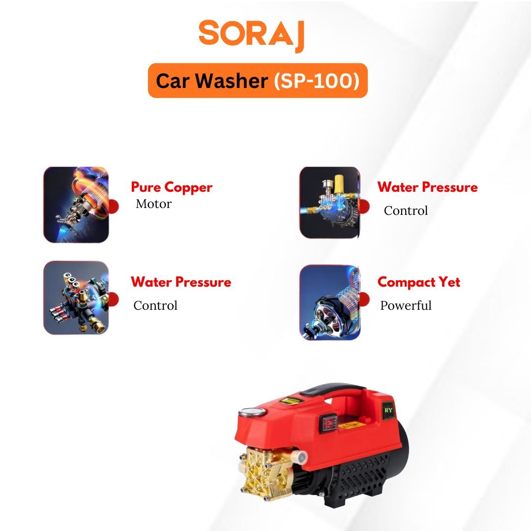 The SORAJ Car Washer SP-100 is a compact and powerful cleaning solution designed for easy and effective vehicle washing. Built with a reliable electric motor and user-friendly features, this portable washer makes car cleaning quick, efficient, and hassle-free — perfect for home, garage, and professional use.