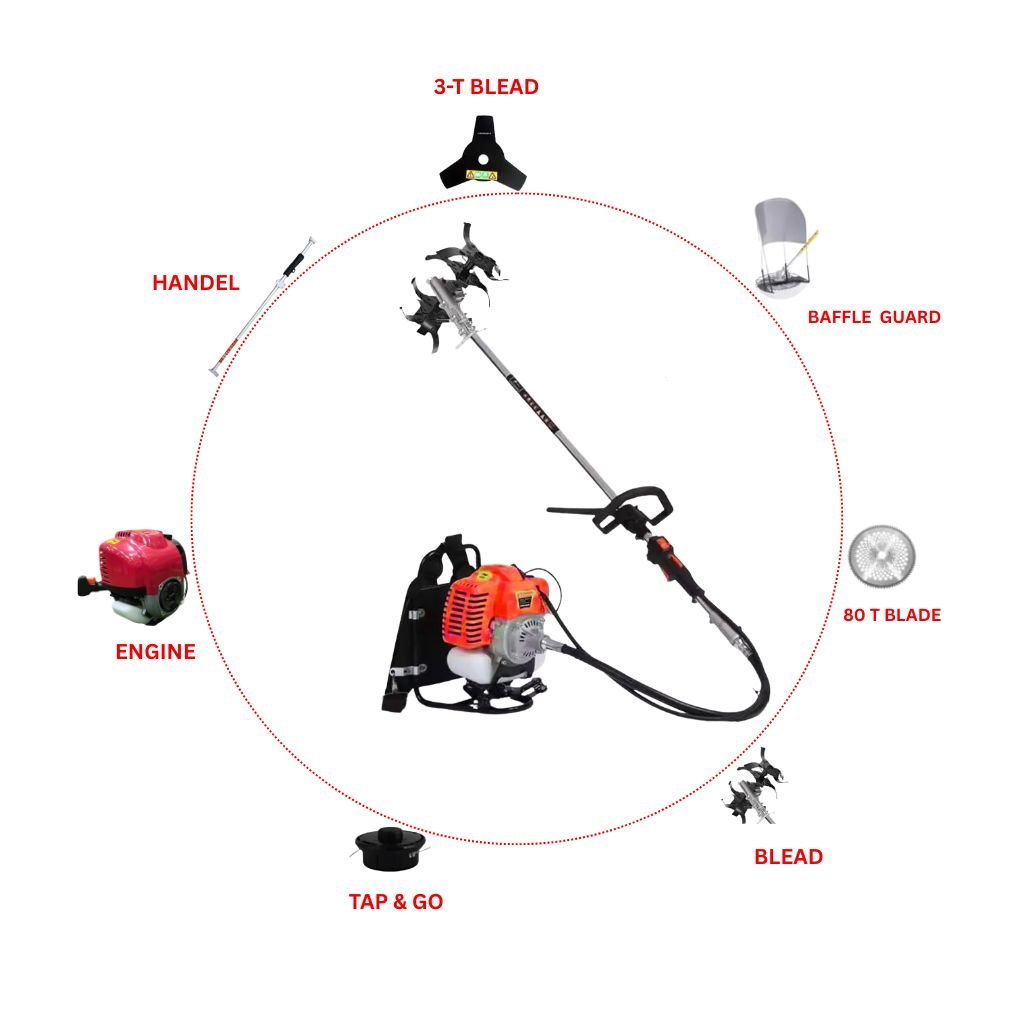The ergonomic back pack design ensures comfortable weight distribution, reducing operator fatigue during long working hours. With a sturdy build and total weight of 11 kg, this brush cutter is built for long-lasting use in demanding conditions. The 1-liter fuel tank supports extended operation, making it ideal for agriculture fields, gardens, plantations, and roadside maintenanceKey Features: