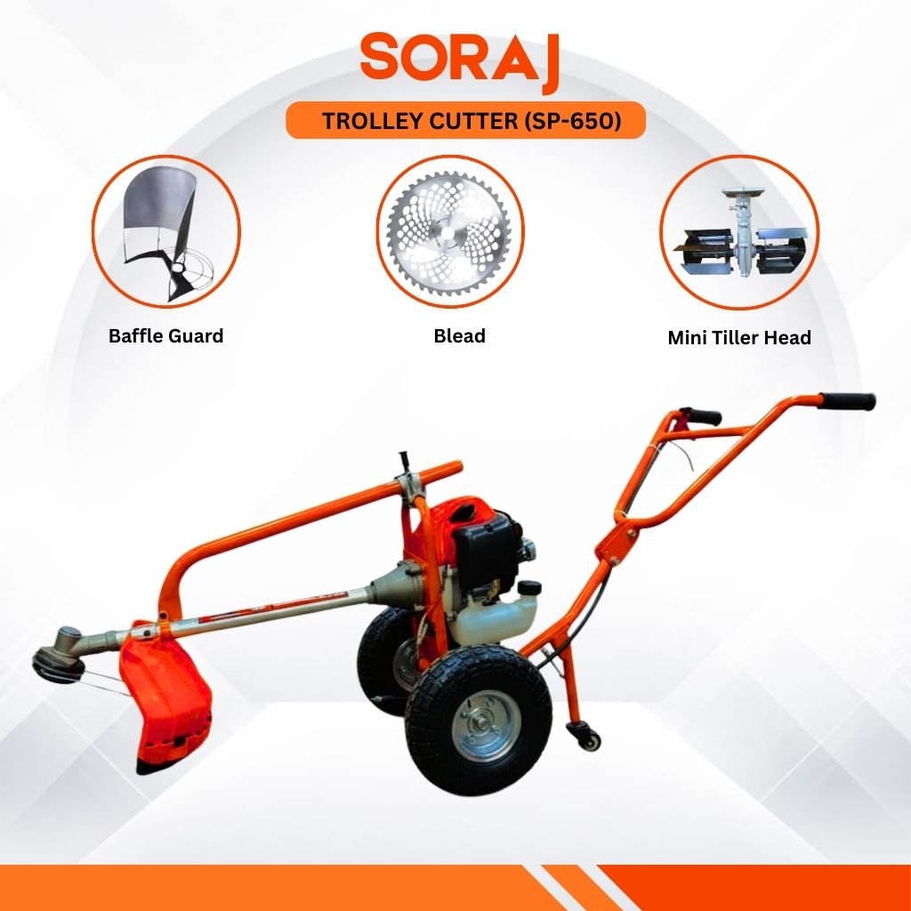The SORAJ SP-650 Trolley Brush Cutter is a powerful and reliable machine designed for efficient cutting of grass, weeds, and dense vegetation. Equipped with a 52cc 4-stroke engine, it delivers strong performance with smooth operation and low vibration. The trolley-style design reduces operator fatigue and makes handling easy, even during long working hours.