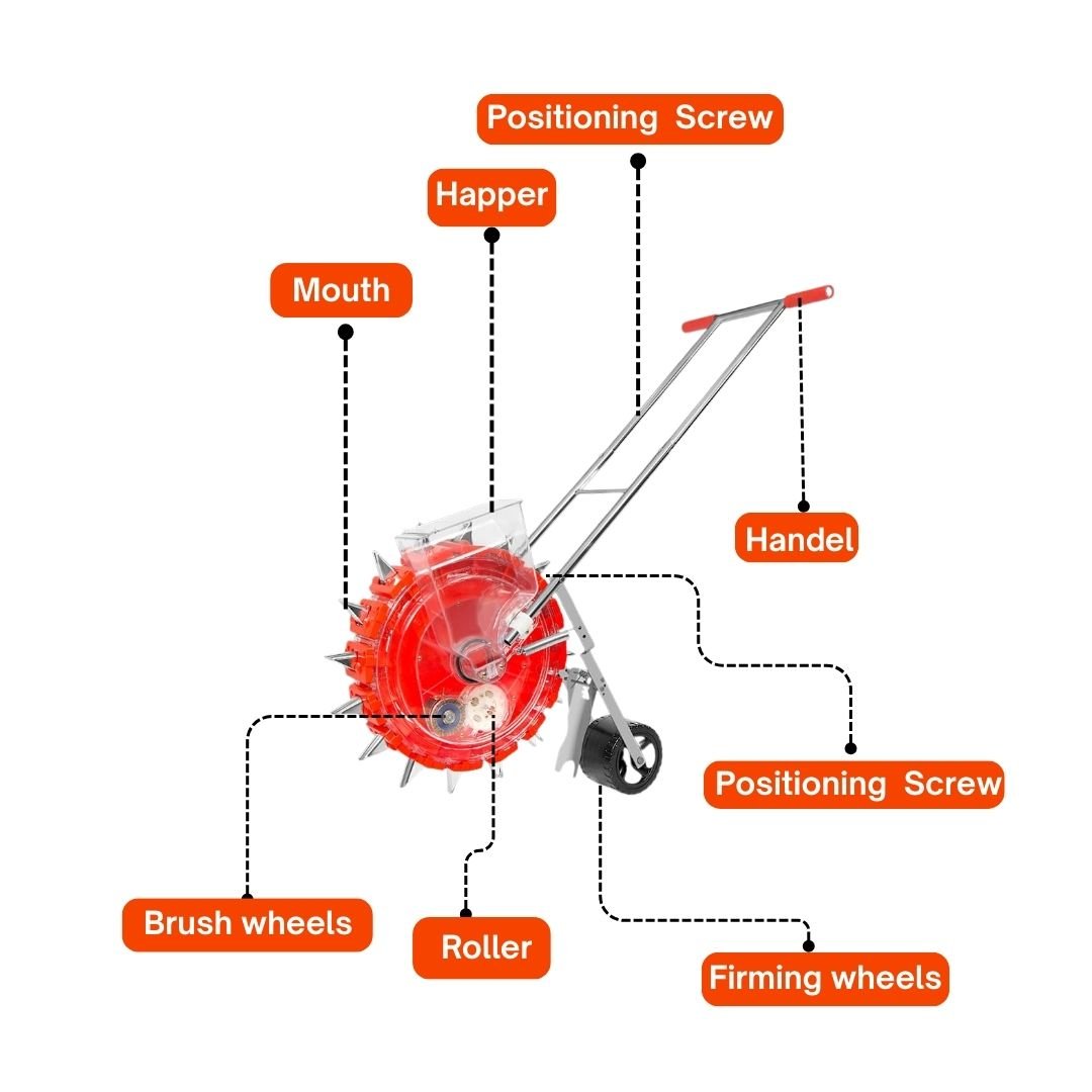 Equipped with a positioning screw, the seeder allows fine adjustment for accurate seed depth and spacing. The hopper provides easy seed loading, while the specially designed mouth ensures smooth and controlled seed release.A strong handle offers comfortable manual operation and better control during use. The firming wheels press soil gently around the seed, improving seed-to-soil contact for better germination. The roller ensures smooth movement across the soil surface, and brush wheels help maintain clean and accurate seed delivery.