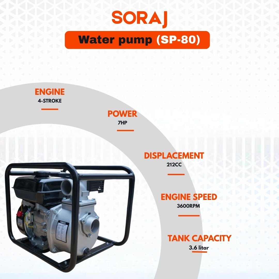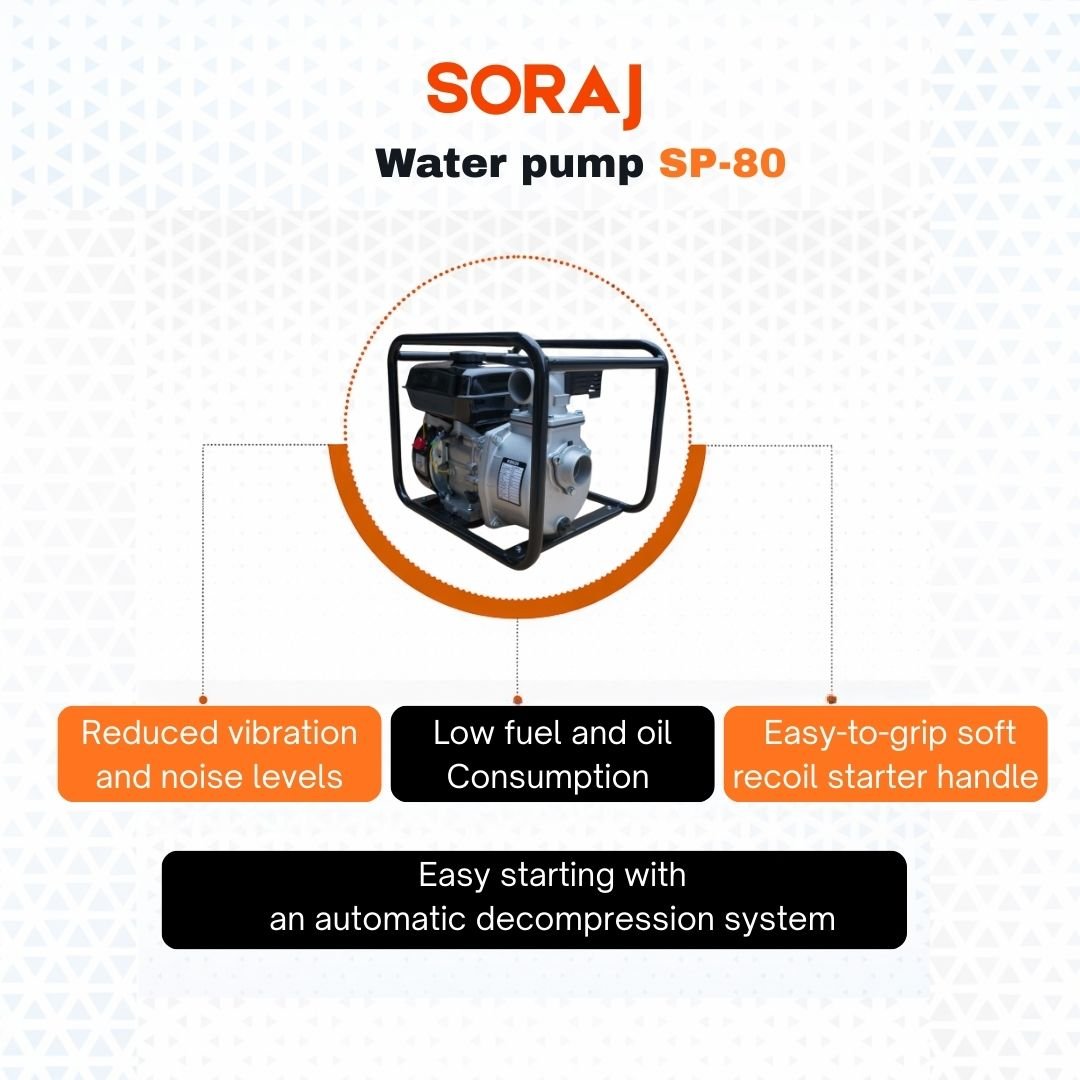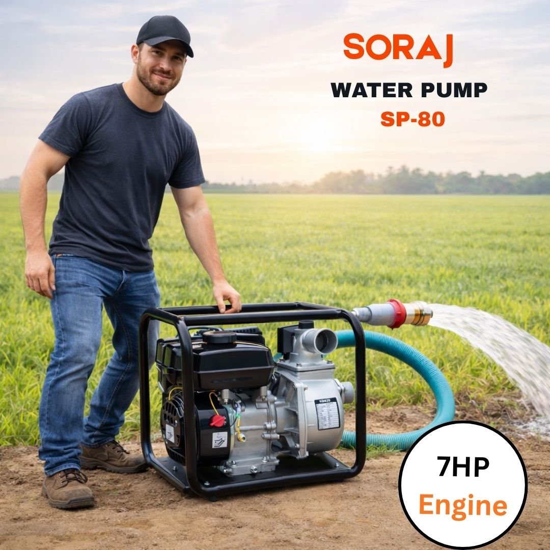 The SORAJ Water Pump SP-80 is a powerful and versatile water pump designed for demanding water transfer tasks across agriculture, construction, commercial, and residential applications. Built with robustness and high performance in mind, the SP-80 delivers consistent suction and discharge capacity with efficient engine power.