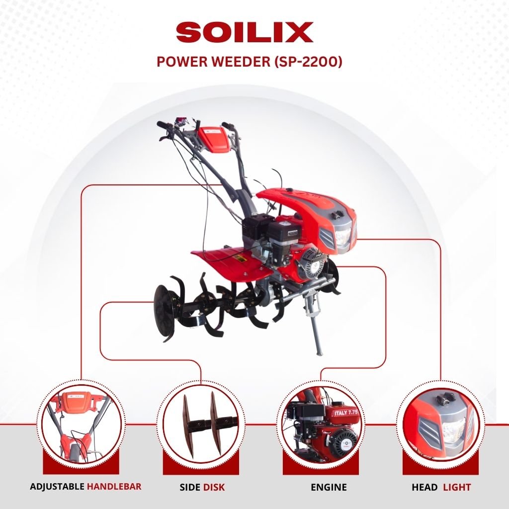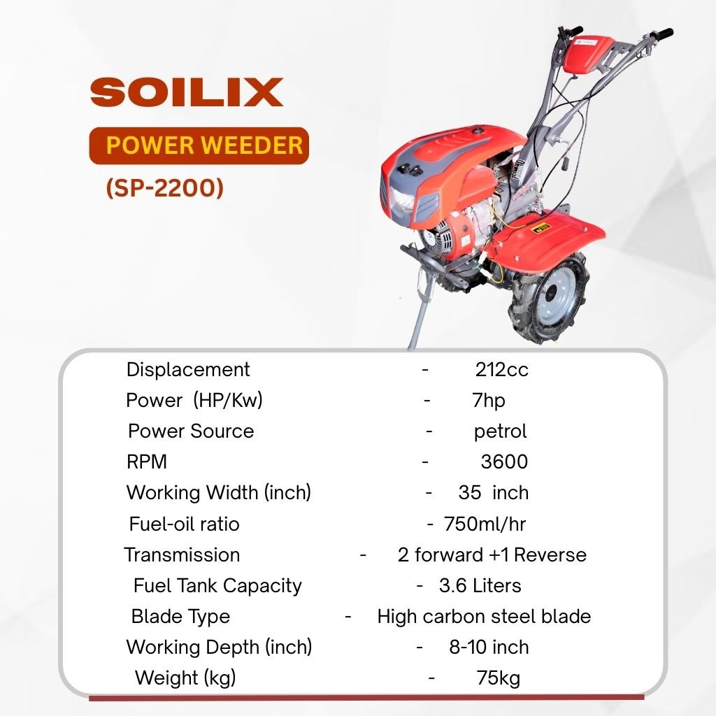 The Power Weeder with SOILIX Engine (7.5 HP) is a high-performance agricultural power weeder machine designed for efficient weed removal, soil cultivation, and inter-row farming. Built with a powerful 212 CC petrol engine, this machine delivers reliable performance for small to medium farms.