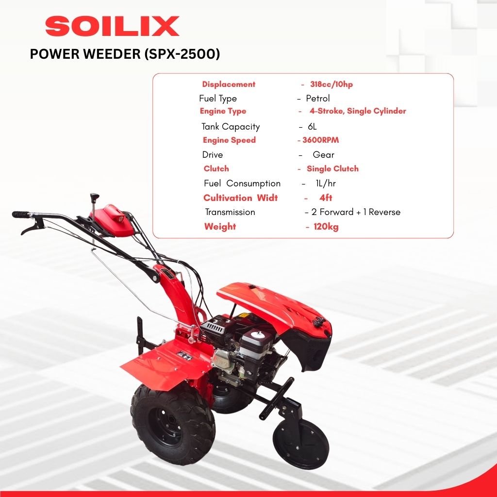 The SOILIX Power Weeder Model SPX-2500 is a high-performance agricultural power weeder machine designed for efficient weed control, soil cultivation, and inter-row farming. Powered by a robust 10 HP petrol engine, this machine ensures superior performance even in tough soil conditions.