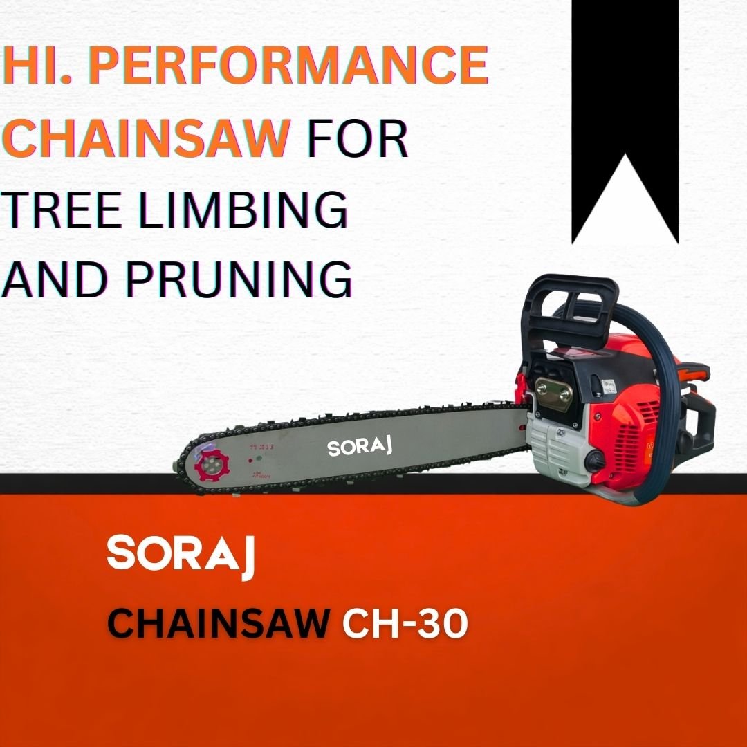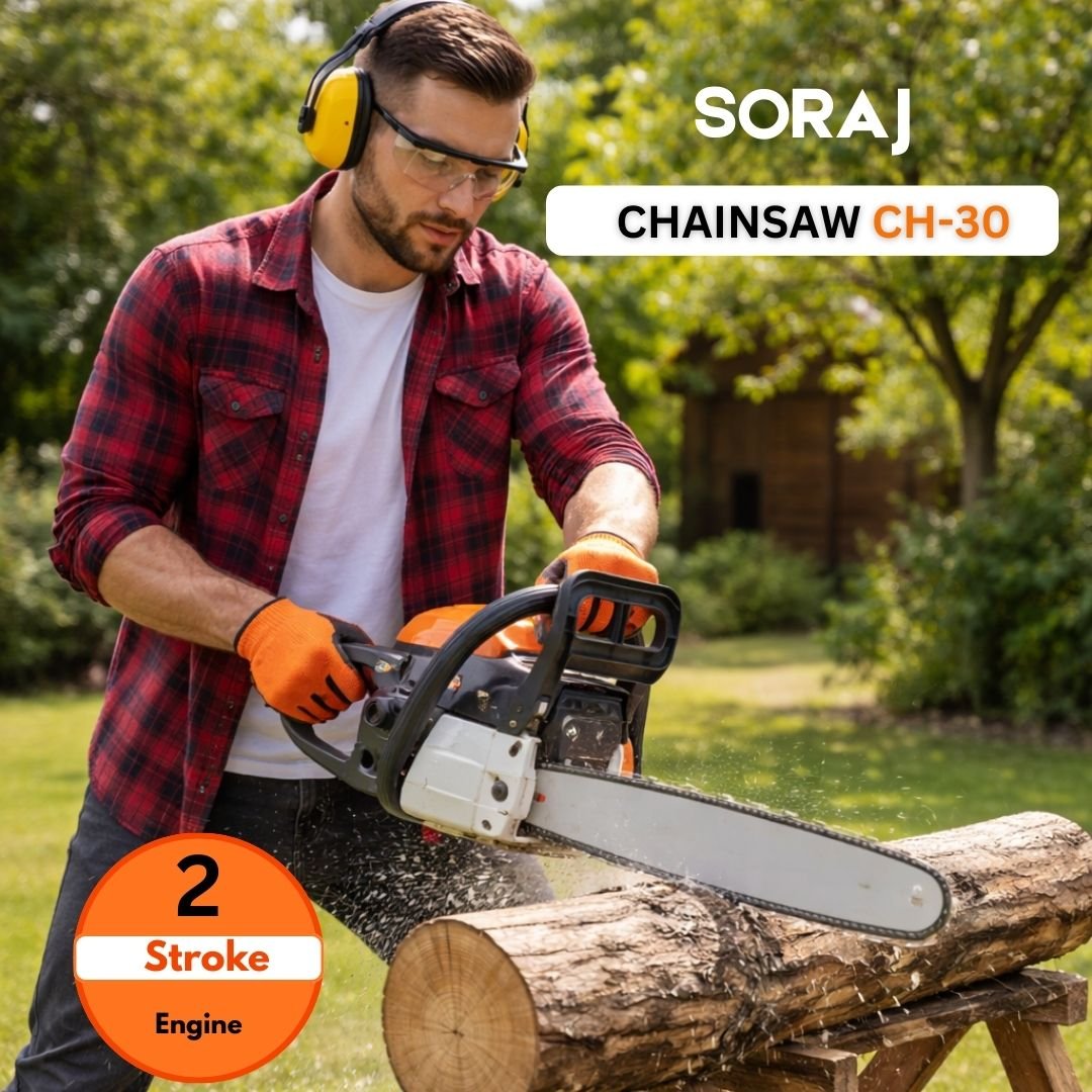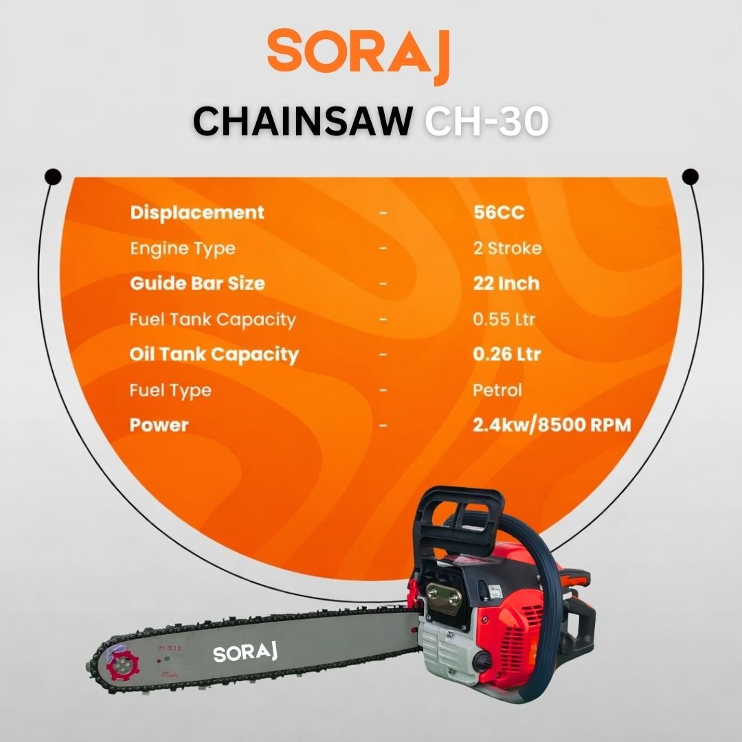 The SORAJ CHAINSAW CH-30 is a powerful and durable cutting machine designed for efficient and reliable performance. Powered by a 56cc 2-stroke air-cooled engine, this chainsaw offers smooth operation with balanced power output, making it suitable for heavy-duty cutting tasks.