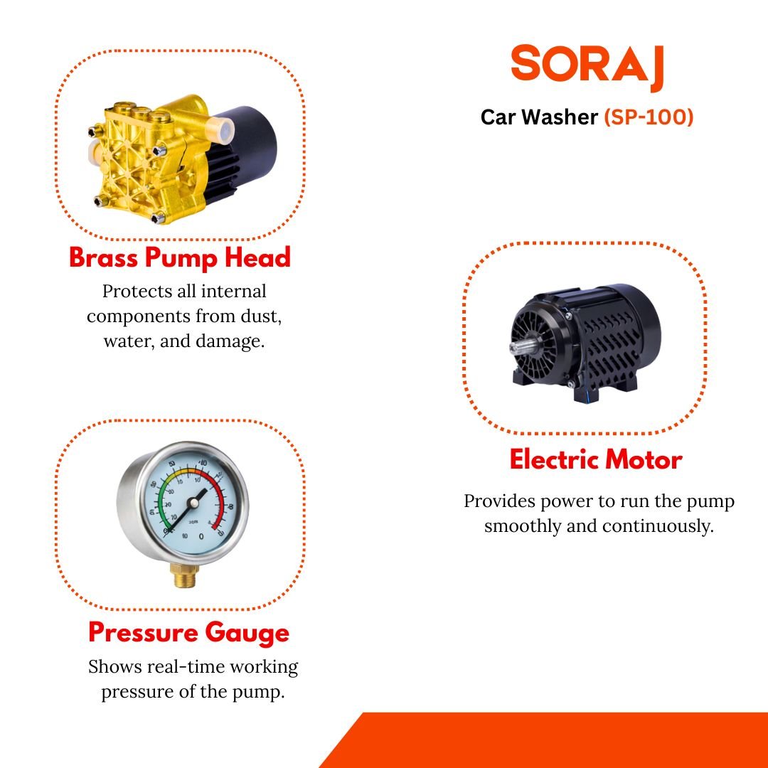 The SORAJ Car Washer SP-100 is a compact and powerful cleaning solution designed for easy and effective vehicle washing. Built with a reliable electric motor and user-friendly features, this portable washer makes car cleaning quick, efficient, and hassle-free — perfect for home, garage, and professional use.
