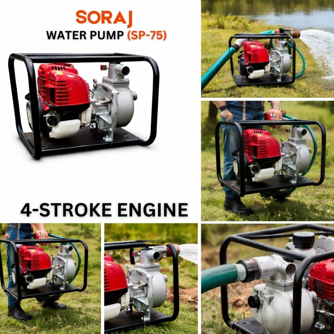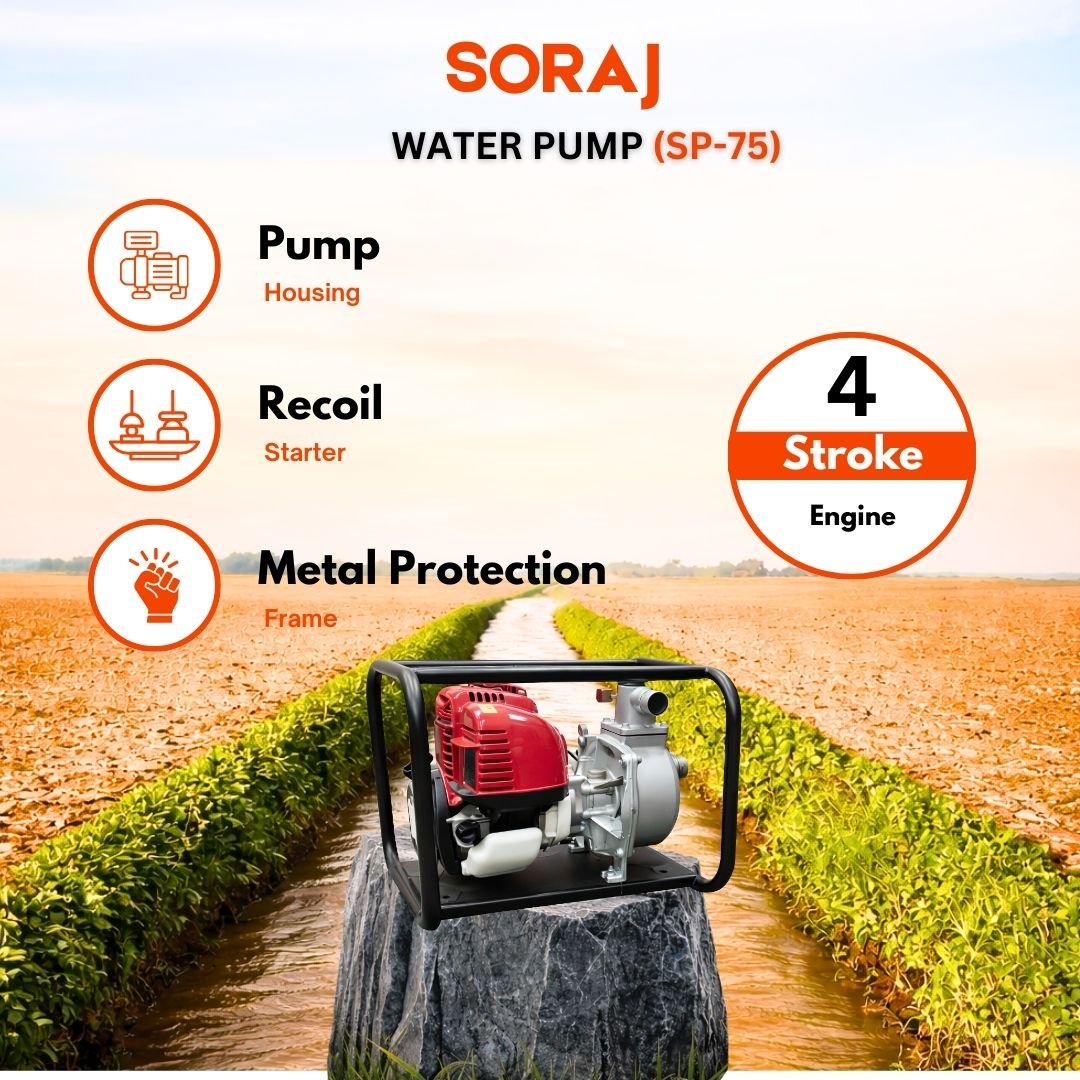 The SORAJ Water Pump SP-75 is a robust, high-performance 4-stroke water pump designed for efficient water transfer in agriculture, gardening, construction, and household applications. Built with durability and ease of use in mind, this pump delivers reliable performance wherever you need it.