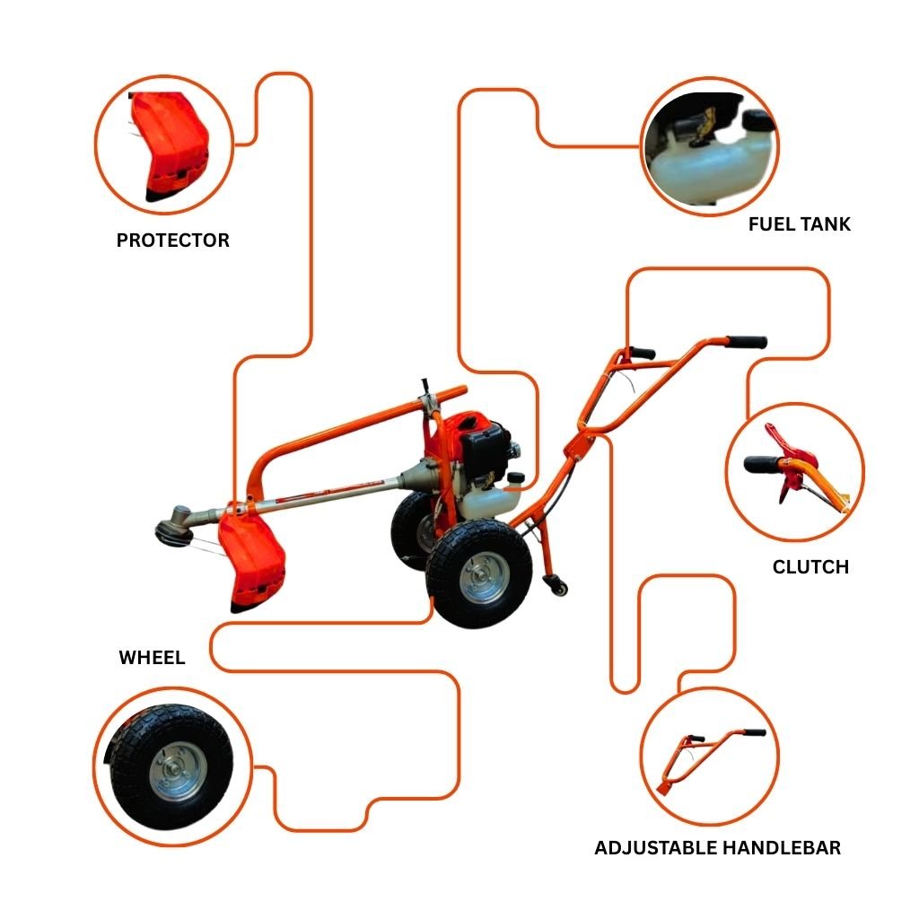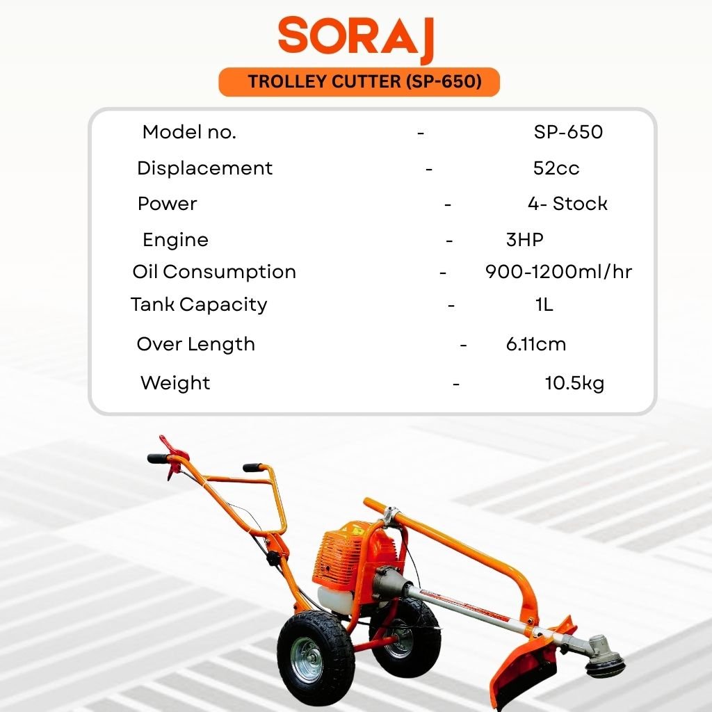The SORAJ SP-650 Trolley Brush Cutter is a powerful and reliable machine designed for efficient cutting of grass, weeds, and dense vegetation. Equipped with a 52cc 4-stroke engine, it delivers strong performance with smooth operation and low vibration. The trolley-style design reduces operator fatigue and makes handling easy, even during long working hours.